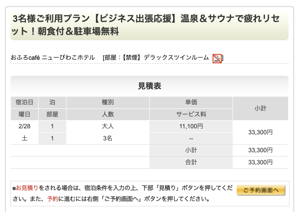 大人3人での宿泊で、通常料金は1人11,100円(朝食込・夕食別、サービス料・消費税込)、3人合計で33,300円でした。
