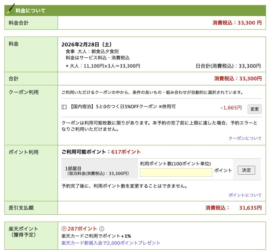さらに楽天ポイントも287ポイント獲得予定で、実際の支払いは31,635円とお得に予約できました。